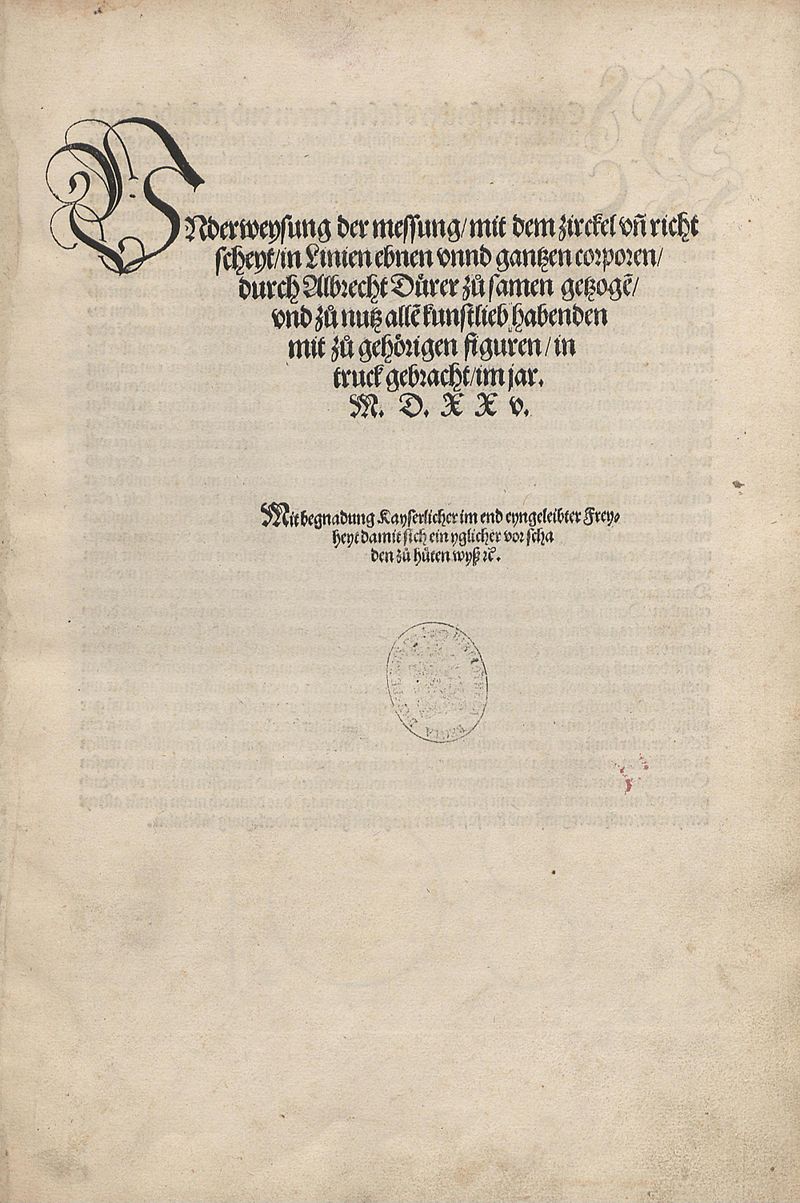 丟勒關于幾何學的著作名叫《量度四書》(德文名:Underweysung der Messung mit dem Zirckel und Richtscheyt,英文可譯為《使用圓規、直尺的量度指南》或《量度藝術教程》),其中內容主要如下: