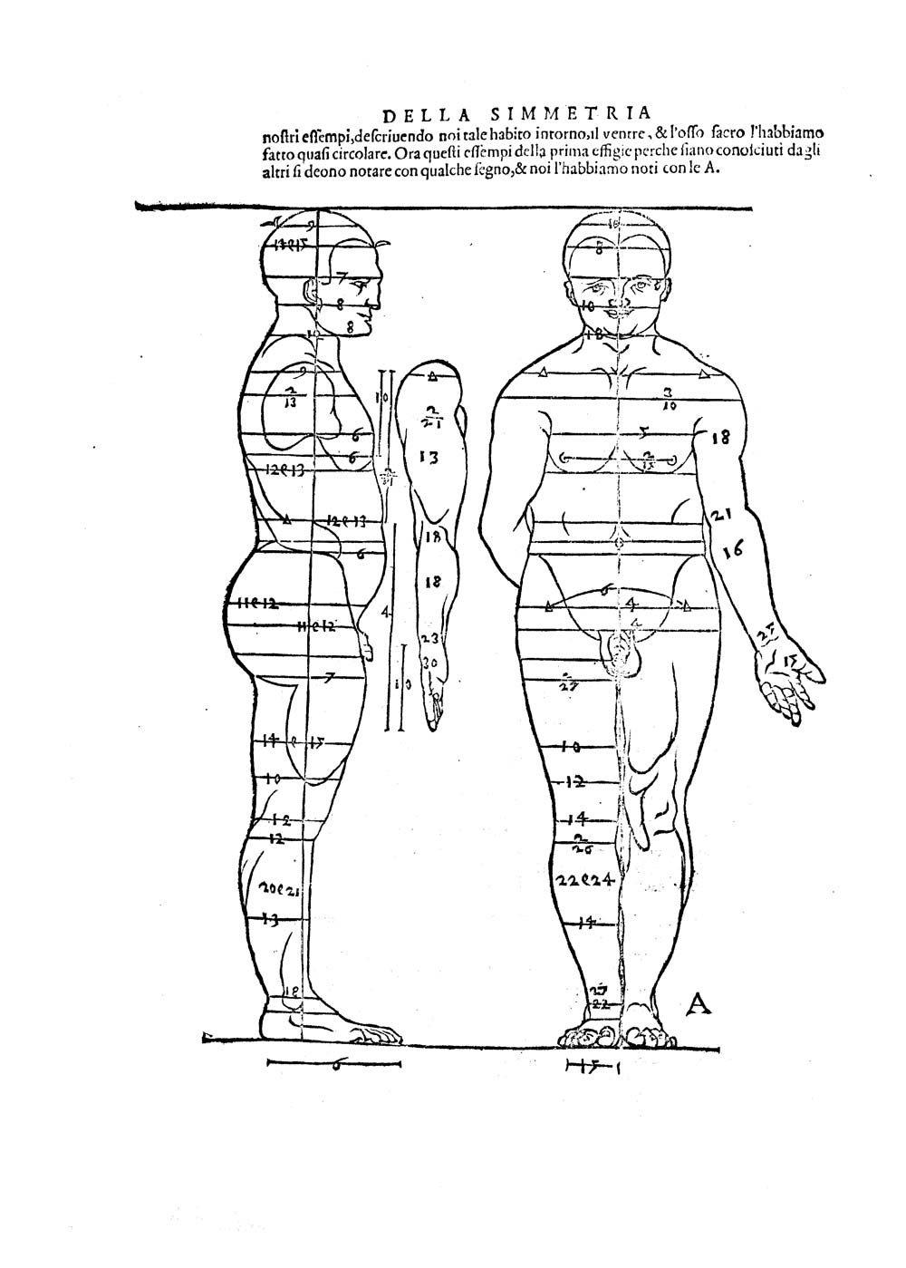 丟勒關于人體比例的著作名叫《人體比例四書》(德文名:Vier Bücher von Menschlicher Proportion),完成于1528年。第一卷書主要撰寫與1512至1513年,完成與1523年。展現了五種不同結構類型的男性和女性的體形,身體的所有部分被描繪成總高度的一段。丟勒的這些結構是以古羅馬的維特魯威以及丟勒對“二三百位真人”的經驗觀察結果為依據的"。第二卷書中包括八種更進一步的類型。關于這一系統,丟勒可能是向1525年的弗朗西斯科?迪?喬治的《'De harmonica mundi totius'》一書學習的。在第三卷書中,丟勒給出了一些可以用來修改人體比例的法則,包括凸面鏡及凹面鏡數學模擬法;這里丟勒還論述了面相學。第四卷書專門討論運動原理。