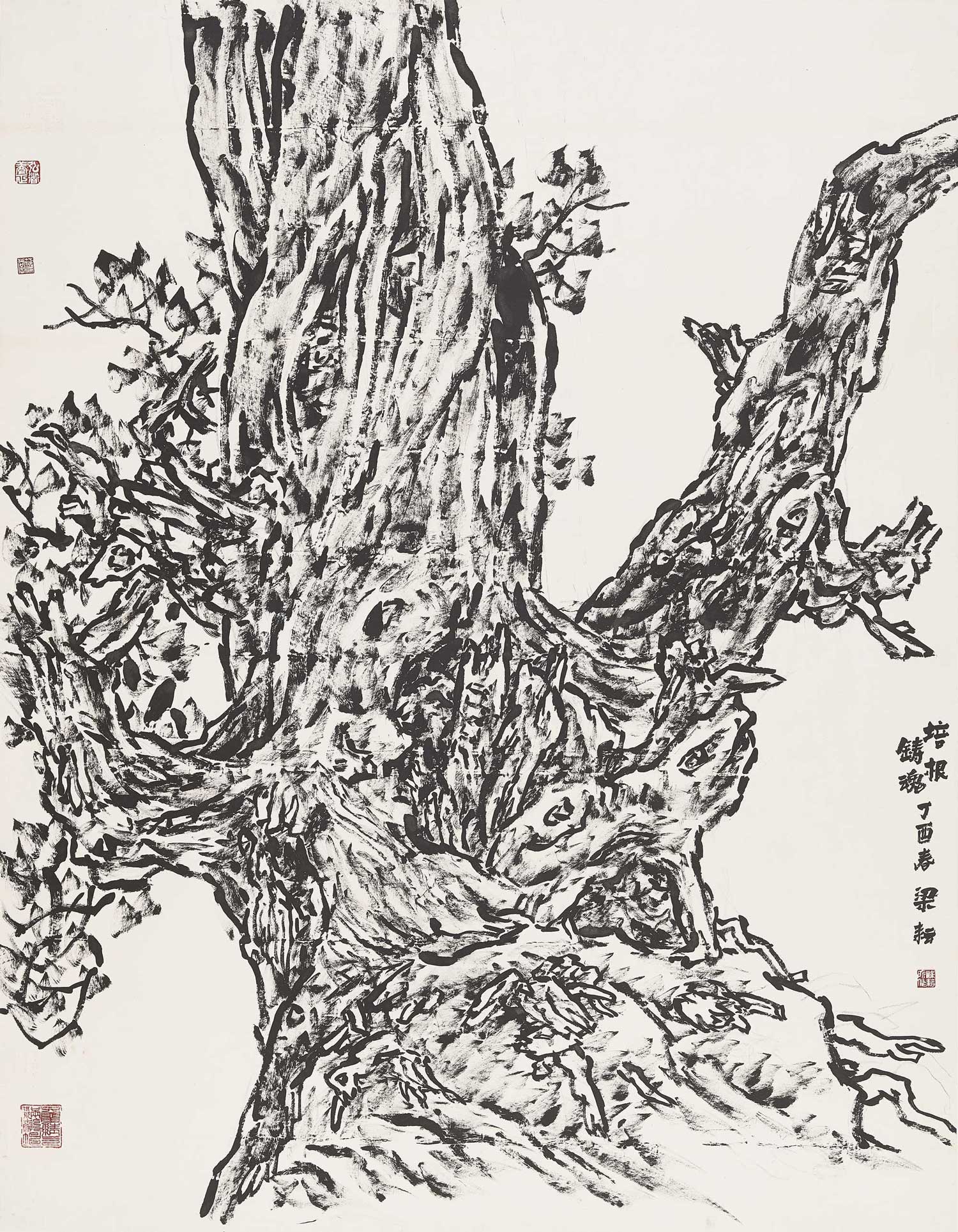 為人誠實憨厚的梁耘,一心要把他生于斯長于斯的這片故土所包含的力和美,用自己的繪畫作品表現出來。他在創作過程中逐漸體會到,所謂有個性的繪畫風格是在長期藝術勞動中自然形成的,其中最重要的是畫自己面對大自然的真切感受,不模仿古人,不追慕時尚。這也正是梁耘為人直率、坦誠和憨厚的性格所決定了的;而他這位陜北高原漢子所具有的寬闊心胸和質樸品質,也與蒼茫雄渾的大自然心心相印。因此,當他掌握了傳統國畫的規則和技巧之后,他的水墨藝術創作的個性面貌便逐漸顯示出來:在粗實、厚重中顯示律動和韻味,在蒼勁、雄渾中展示靈性和生氣,作品展現出醇厚華滋的面貌。大概由于他認為有千年生命的古柏最能表現他的審美理想,為它們造像的作品在他創作中占有很大的比重。
