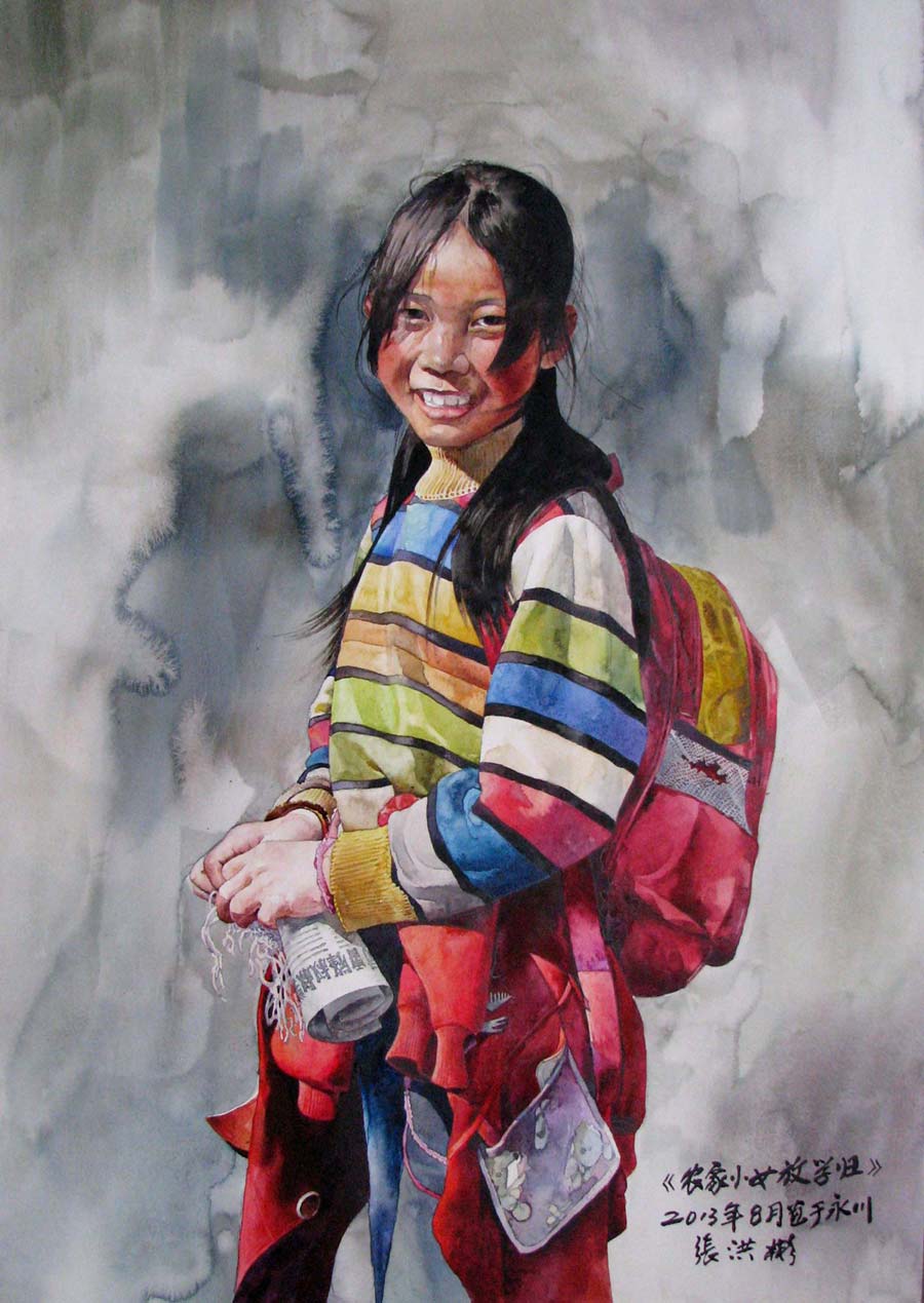 水彩《農家女孩放學歸》76×53cm 2013年