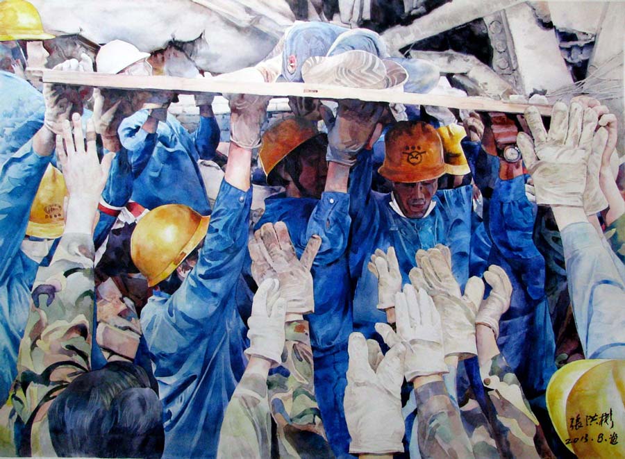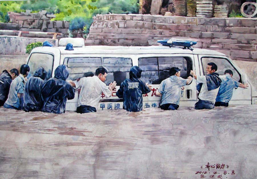 水彩《眾志成城》107×76cm 2012年