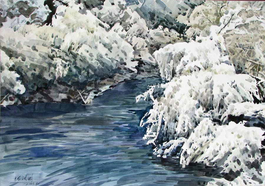 水彩畫《高原春雪》107×75cm 2003年