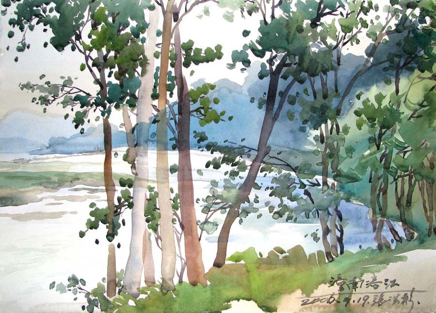 水彩畫《潼南涪江岸上》55×39cm 2006年