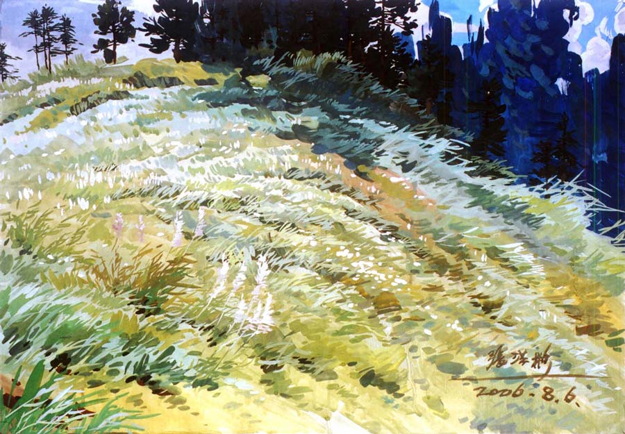 水粉畫《重慶黑山谷山頂草坪》75×52cm 2006年