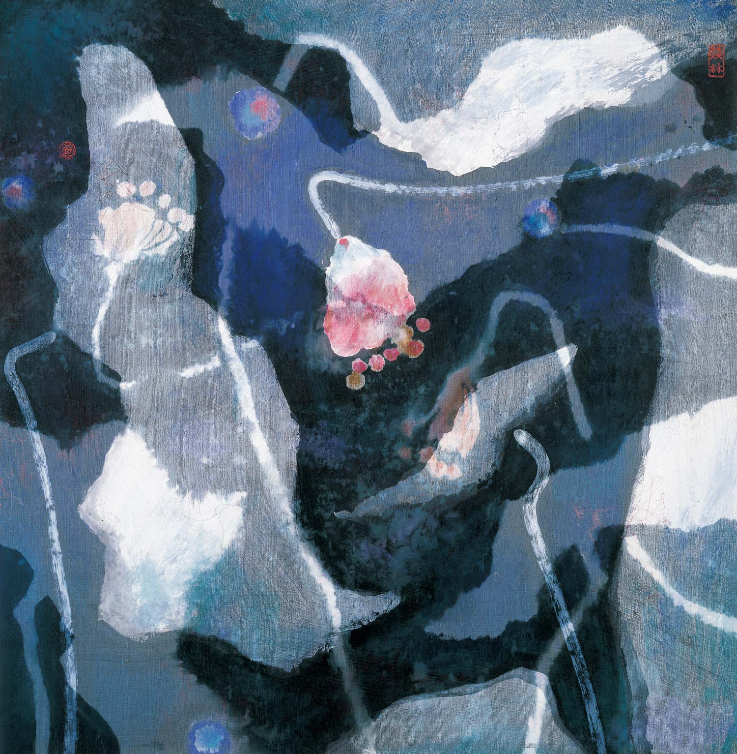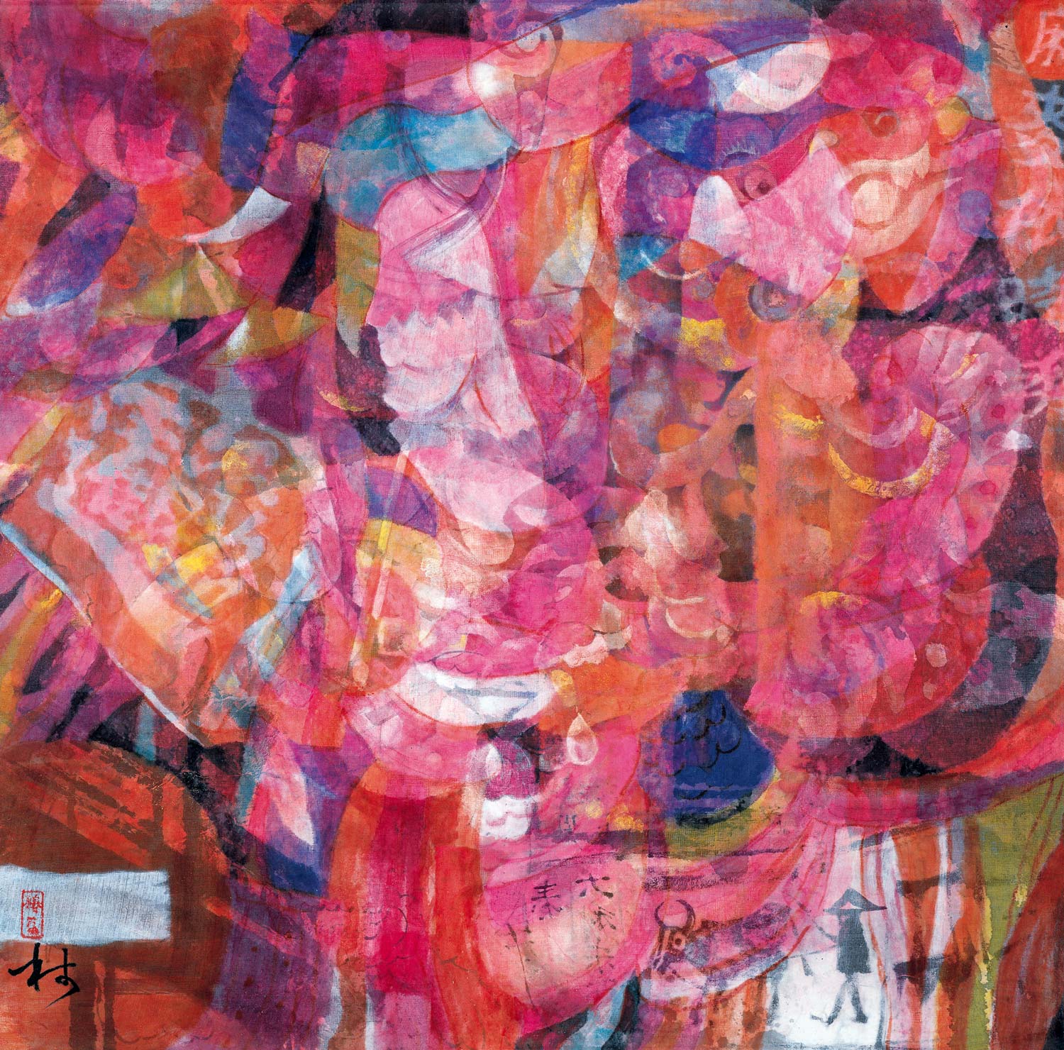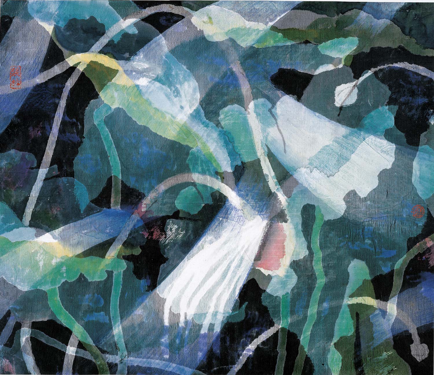 穆益林的藝術成就遠不在對古代帛畫技法的硏究上,而主要表現于他的帛畫創新探索成果。他深知,古老帛畫技法的復興,必須結合新的藝術實踐,做“以古開今”的努力,方能達到應有的社會影響。他從熟悉帛畫質材、技能特性入手,不斷發掘新的輔助性材料,嘗試不同顏料混合使用或前后配合使用的方法,深入探索帛的正反兩面采用不同顏色、不同形象,以相互折疊的形式進行創作,使帛畫隨著觀賞者的不同角度和光源的變化,顯示出畫面變化無窮的奇異色彩和帛的肌理色澤。在此基礎上,他進一步從題材、技法品種和和表現語言方面拓展帛畫的表現范疇,使之不僅能自如地采用工筆、寫意、沒骨等方法描寫人物、花鳥、山水,更從現代審美意識出發,廣泛地從其它民族傳統藝術、西方現代藝術和民間藝術中吸收營養,并發揮藝術創造中應有的潛意識功能,在縝密構思的“有意”和偶然效果的“無意”之間,在具像、抽象、意象語言的交錯運用中,馳騁自己的才能,享受藝術探索的無限樂趣,創造出不少以色彩飽和度為特點的、富有強烈藝術表現力的現代帛畫佳作,如《鬧元宵》、《元宵印象》、《天涯客》、《天地皆詩系列》等。透疊法是穆益林在帛畫中運用得最為廣泛,也是最為熟練的一種表現手法,甚至可以說是他的帛畫藝術的符號。在傳統的繪畫語言中,重疊的圖式是對圖中形象的主、次關系的一種表達。而透明性使傳統意義上的主與次的等級關系被打破了。透疊法可以說是由新材料帶來的新技法,其平面性和虛幻性是現代藝術的典型特征。穆益林在《天涯客》系列和《荷塘印象》系列中,將透疊法發揮得淋漓盡致,交錯重疊的丹頂鶴或翩翩起舞,或昂頸高歌,虛幻的圖像里充滿了詩情畫意。而滿塘的荷花層層疊疊,在天光水色之間漂浮,線與面奏起的是一支支幽靜的小夜曲。