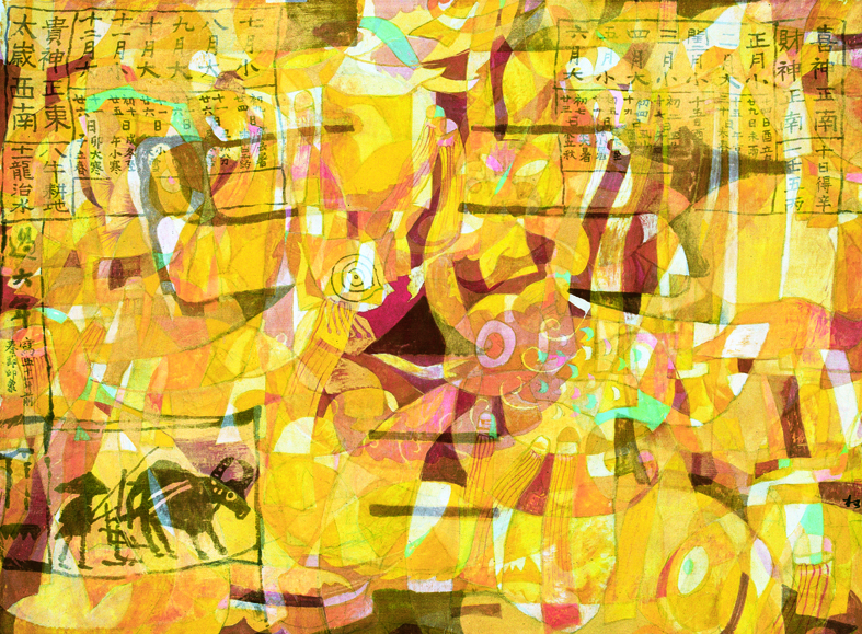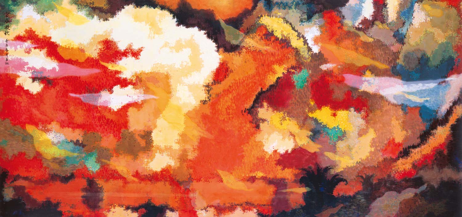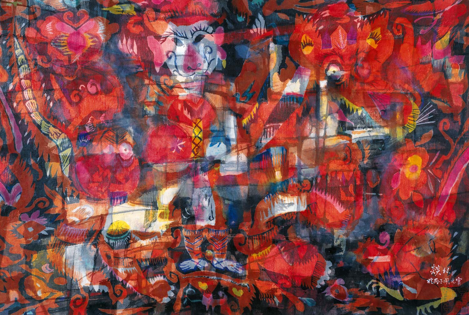 穆益林的藝術成就遠不在對古代帛畫技法的硏究上,而主要表現于他的帛畫創新探索成果。他深知,古老帛畫技法的復興,必須結合新的藝術實踐,做“以古開今”的努力,方能達到應有的社會影響。他從熟悉帛畫質材、技能特性入手,不斷發掘新的輔助性材料,嘗試不同顏料混合使用或前后配合使用的方法,深入探索帛的正反兩面采用不同顏色、不同形象,以相互折疊的形式進行創作,使帛畫隨著觀賞者的不同角度和光源的變化,顯示出畫面變化無窮的奇異色彩和帛的肌理色澤。在此基礎上,他進一步從題材、技法品種和和表現語言方面拓展帛畫的表現范疇,使之不僅能自如地采用工筆、寫意、沒骨等方法描寫人物、花鳥、山水,更從現代審美意識出發,廣泛地從其它民族傳統藝術、西方現代藝術和民間藝術中吸收營養,并發揮藝術創造中應有的潛意識功能,在縝密構思的“有意”和偶然效果的“無意”之間,在具像、抽象、意象語言的交錯運用中,馳騁自己的才能,享受藝術探索的無限樂趣,創造出不少以色彩飽和度為特點的、富有強烈藝術表現力的現代帛畫佳作,如《鬧元宵》、《元宵印象》、《天涯客》、《天地皆詩系列》等。透疊法是穆益林在帛畫中運用得最為廣泛,也是最為熟練的一種表現手法,甚至可以說是他的帛畫藝術的符號。在傳統的繪畫語言中,重疊的圖式是對圖中形象的主、次關系的一種表達。而透明性使傳統意義上的主與次的等級關系被打破了。透疊法可以說是由新材料帶來的新技法,其平面性和虛幻性是現代藝術的典型特征。穆益林在《天涯客》系列和《荷塘印象》系列中,將透疊法發揮得淋漓盡致,交錯重疊的丹頂鶴或翩翩起舞,或昂頸高歌,虛幻的圖像里充滿了詩情畫意。而滿塘的荷花層層疊疊,在天光水色之間漂浮,線與面奏起的是一支支幽靜的小夜曲。