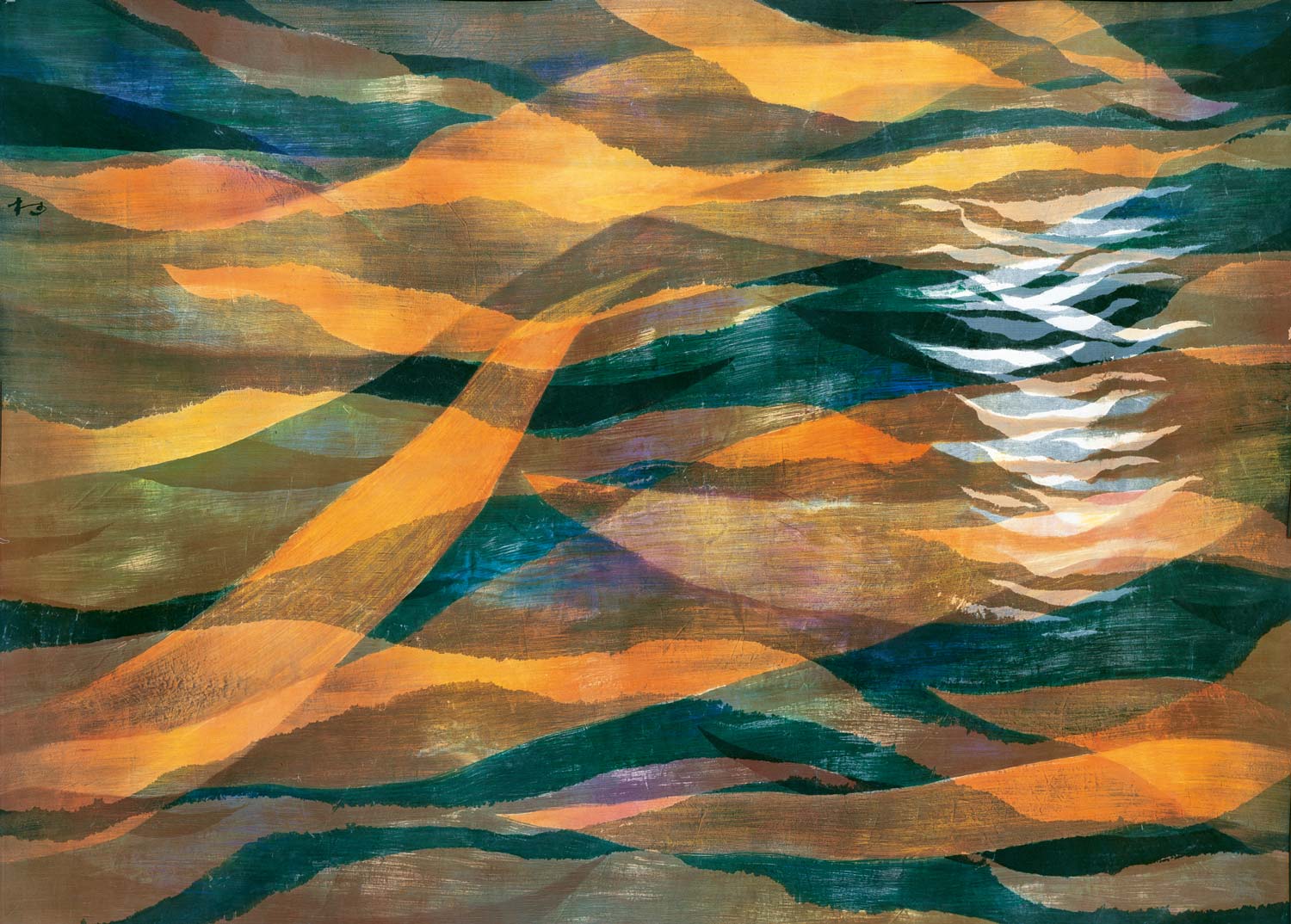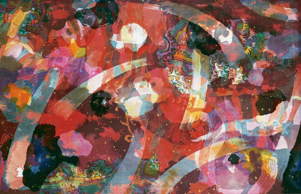 穆益林先生能在傳承古法基礎上,盡其聰明才智把帛畫演變成會產生奇特色變效果的現代帛畫,很重要的原因是他居住在各種文化碰撞交織的上海,大半生受到了海納百川、兼容并蓄的海派文化熏陶。他對中外藝術和美術理論博采眾長細細咀嚼,在上海大學開設過西方繪畫、日本繪畫、中外剪紙、抽象畫審美鑒賞和對潘天壽、黃賓虹研究等課程,在其他大學教授過造型基礎、色彩學、透視學,帶領學生搞了不少博物館的展陳設計,任過上海世博會中國館展陳設計首稿方案的總設計師,也任過上世紀八、九十年代上海搪瓷行業的副總設計師,是搪瓷設計的領軍人物。開闊的國際視野、廣博的藝術修養和豐富的藝術實踐為他帛畫創作的獨辟蹊徑奠定了成功的基礎。